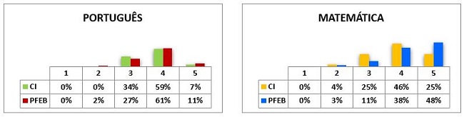 No 9.º ano de escolaridade, foram realizadas provas de avaliação externa nas disciplinas de Português e de Matemática. Tal situação, levou a que as classificações finais das respetivas disciplinas possam ter sofrido alguma alteração, uma vez que a classificação interna contribuiu com um peso de 70% e a classificação externa com um peso 30%. Os gráficos seguintes permitem observar o comparativo entre as classificações obtidas internamente e as classificações das respetivas provas de avaliação externa.
