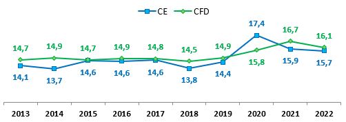 Foram realizados exames nacionais nas disciplinas de Português, Inglês, Filosofia, Matemática A, Desenho A, História A, Física e Química A, Biologia e Geologia, Geometria Descritiva A, História da Cultura e das Artes, Matemática B, Economia A, História B, Geografia A, Literatura Portuguesa e Matemática Aplicada às Ciências Sociais. Nestes exames, registou-se, na 1.ª fase, um total de 309 provas, num conjunto de 212 alunos que frequentou as respetivas disciplinas ou esteve na condição de assistente, ao longo do ano letivo. Por ano de escolaridade, verificou-se uma maior participação nos exames por parte dos alunos do 11.º ano, com 193 provas, num total de 101 alunos, enquanto os 111 alunos do 12.º ano, realizaram 116 provas. No gráfico que se segue foram considerados apenas os alunos que obtiveram classificação interna na respetiva disciplina, sendo apresentado o estudo comparativo entre a média dos resultados obtidos na classificação final da disciplina (CFD) e a média obtida, pelos mesmos alunos, nos exames nacionais (CE) da 1.ª fase.